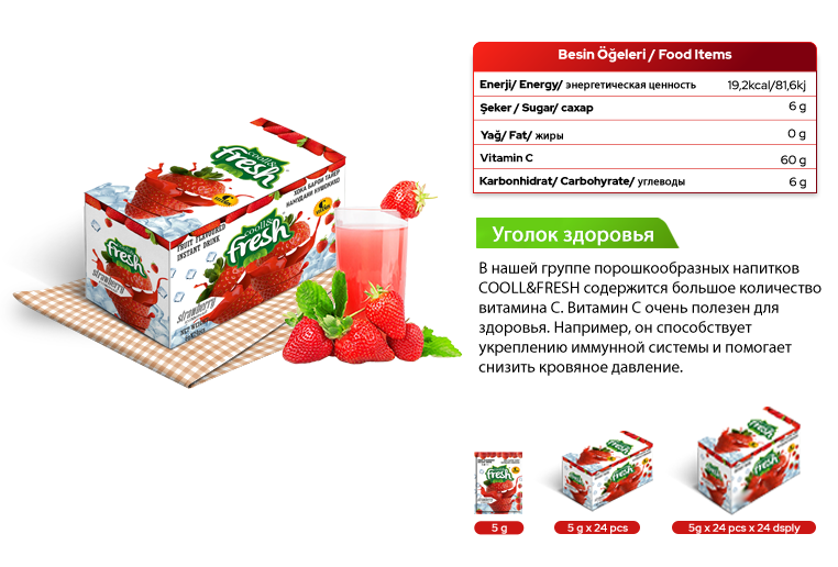 Быстрорастворимый сухой напиток — это порошок, предназначенный для смешивания с водой с целью приготовления напитка. Практичный в приготовлении и обладающий уникальным вкусом, он оставляет во рту великолепный вкус. Вы можете наслаждаться быстрорастворимым напитком COOLL&FRESH в любое время суток.